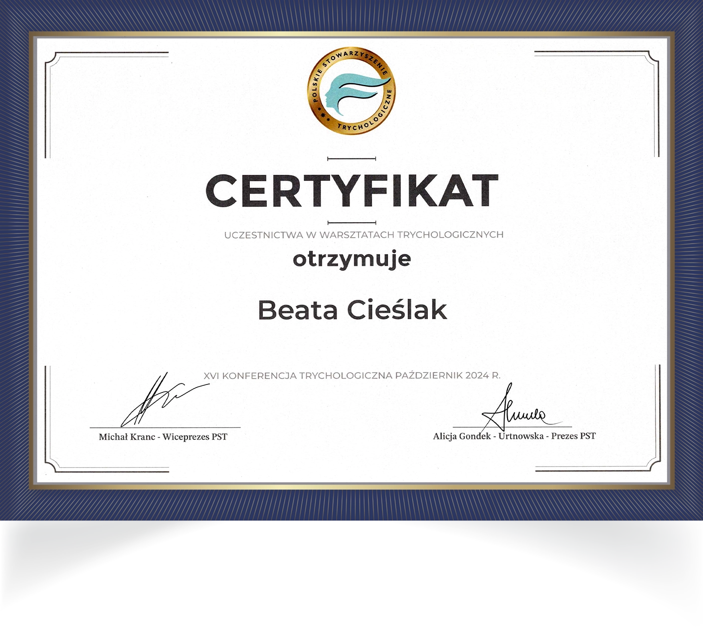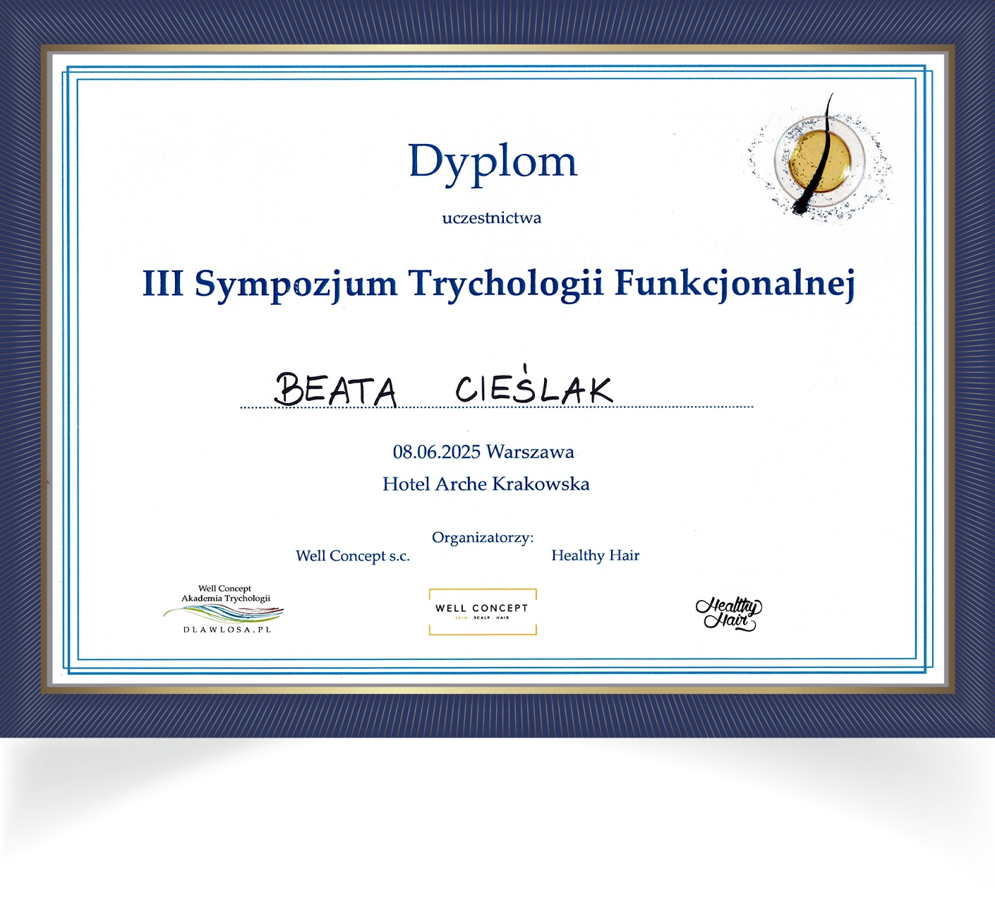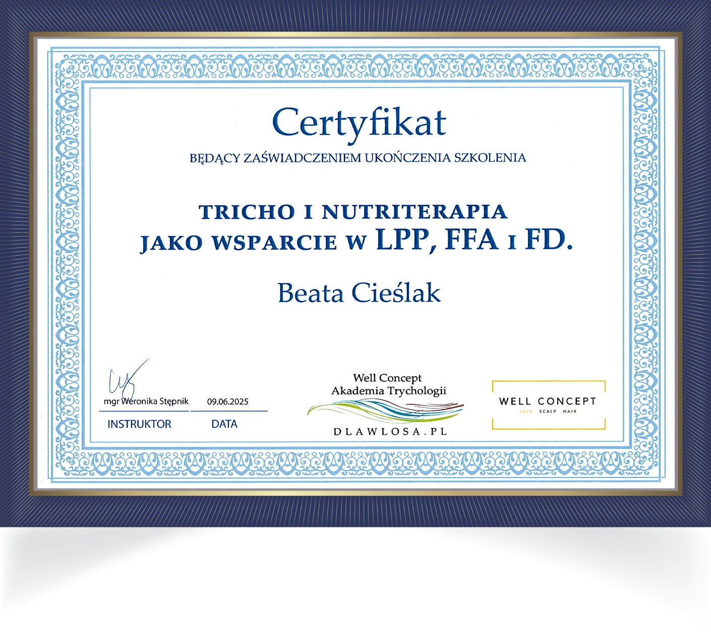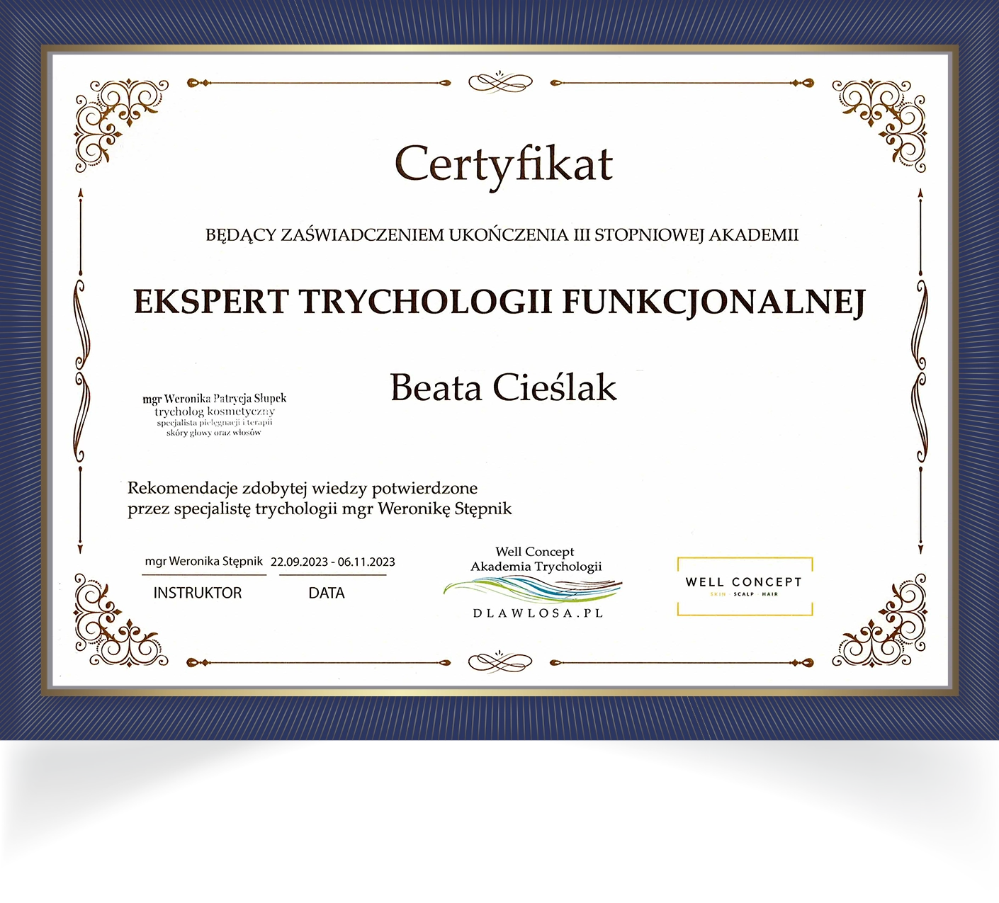 Przez 12lat pracowałam w aptece jako technik farmaceutyczny. Dzięki moim kochanym pacjentom z apteki zauważyłam jak duży problem i wyzwanie stanowią problemy skóry głowy oraz nadmiernie wypadające włosy. Wizyty u specjalistów kończyły się na wypisaniu recepty i odesłaniu do apteki, gdzie oczekiwaliście wsparcia, pomocy oraz dobrej rady jak dalej funkcjonować ze zdiagnozowaną chorobą. Wtedy też zauważyłam, że terapie dermatologiczne potrzebują dodatkowego wsparcia, więc postanowiłam rozwijać się dalej ucząc się od najlepszych. Ukończyłam Akademie Trychologii Funkcjonalnej otrzymując tytuł EKSPERTA TRYCHOLOGII FUNKCJONALNEJ.(Aktualnie na świecie jest nas zaledwie 78 specjalistów w tej dziedzinie). Należę do Polskiego Stowarzyszenia Trychologicznego z czego czerpię obszerną wiedzę. Stale aktualizuję swoją wiedzę aktywnie uczestnicząc w konferencjach i szkoleniach. Ukończyłam także kurs LIFELINE TRAINING SYSTEM z analizy pierwiastkowej włosów, uzyskując dyplom potwierdzający moje umiejętności w interpretacji wyników badań. Jako trycholog wciąż się edukuję, bo tylko ciągłe podnoszenie kwalifikacji pozwala na skuteczną pomoc.